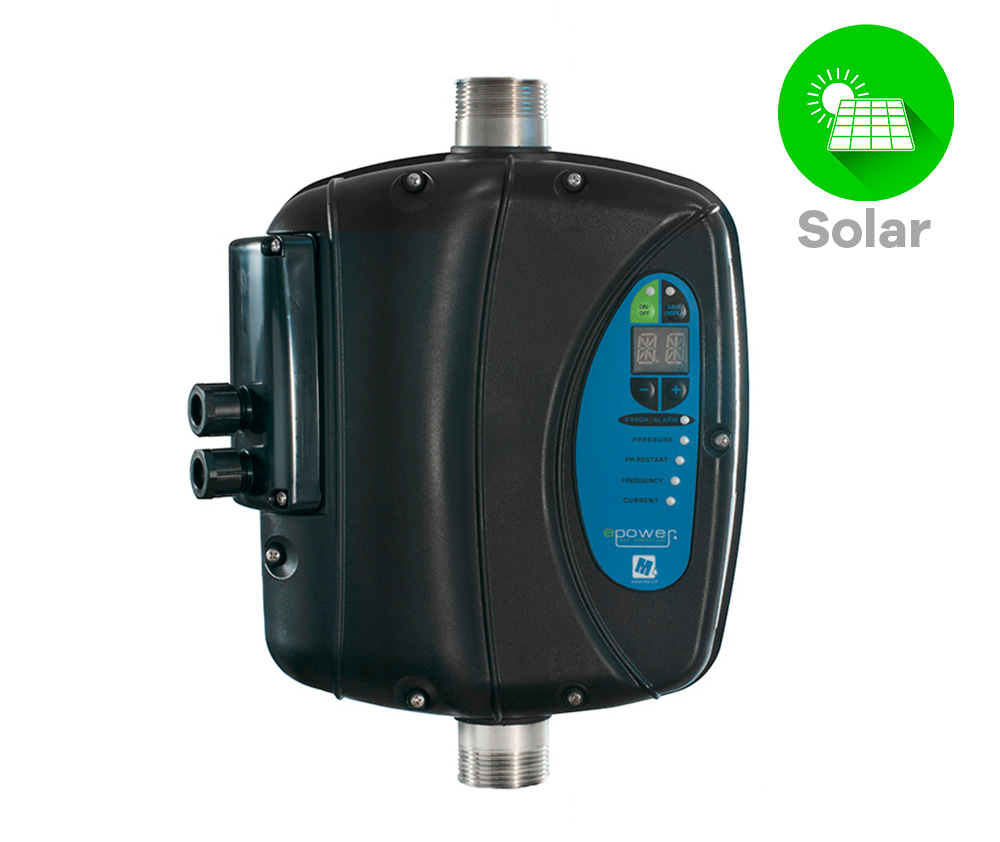 E-Power Solar es un inversor off-grid que convierte la corriente continua de los paneles fotovoltaicos en corriente alterna para alimentar cualquier electrobomba, ajustando automáticamente la velocidad según la energía solar disponible y adaptando el caudal a la radiación solar.